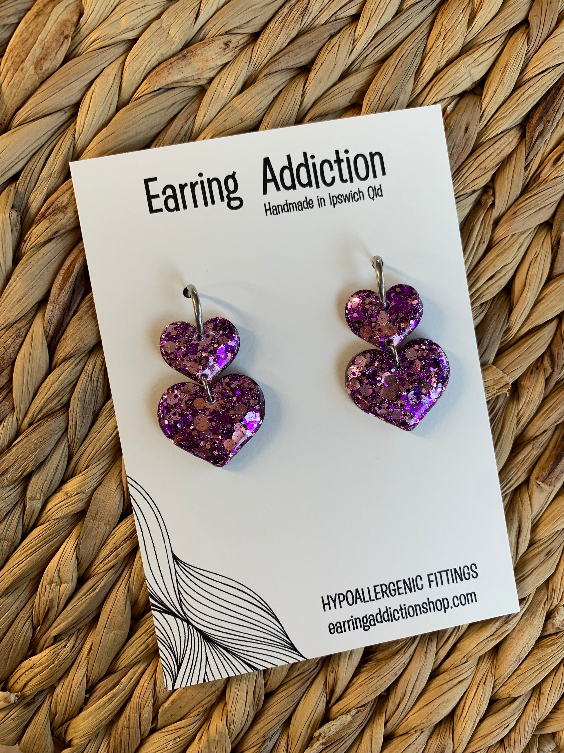 Purple glitter double heart huggy dangles